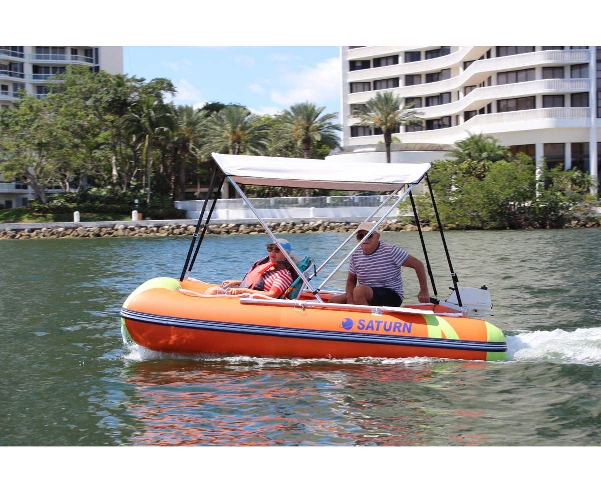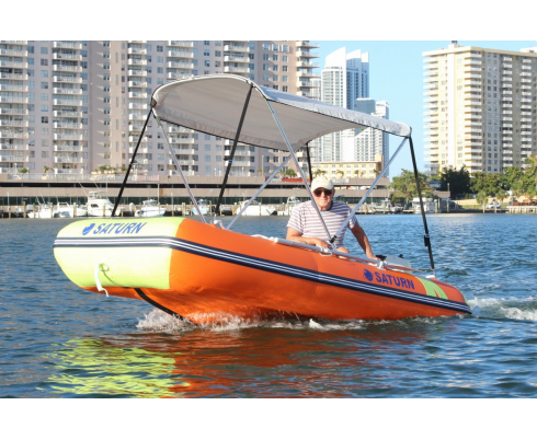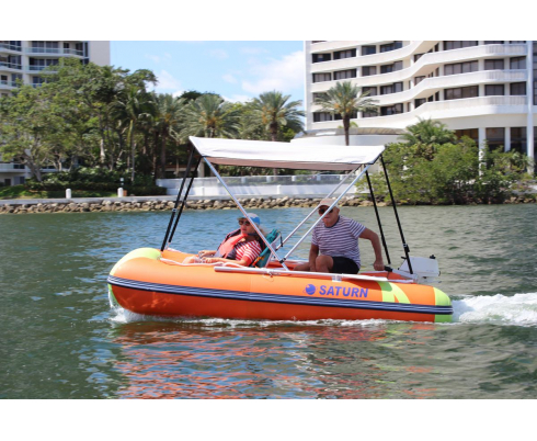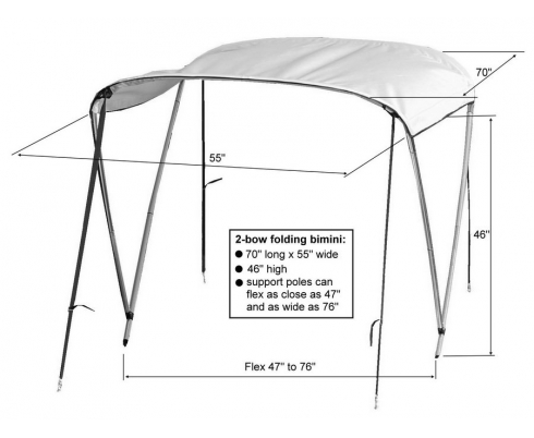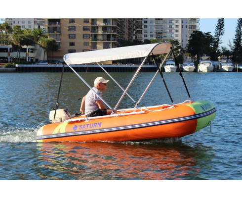 Make your inflatable boat riding experience even more comfortable and protect yourself from harsh ultraviolet rays with a Saturn Deluxe Folding 2-Bow Bimini Top Canopy. No need to use screws. Easy assembly with pushpin. Breaks down into storage bag for easy storage and portable transportation.
