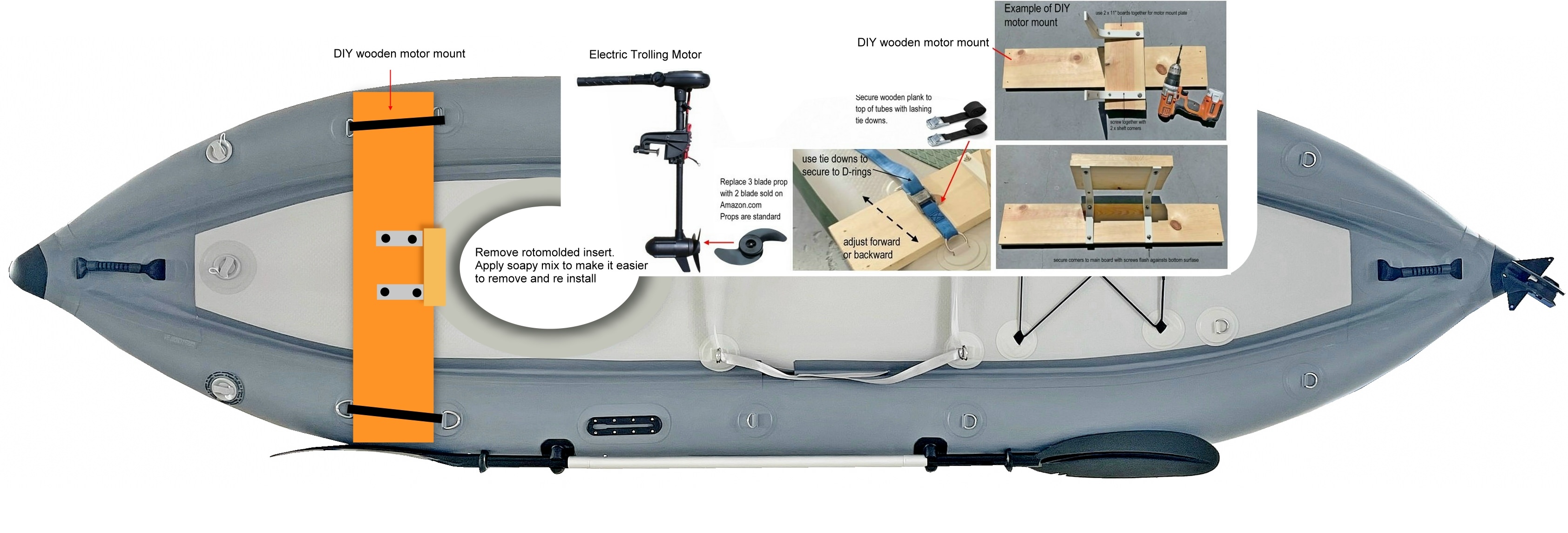 DIY Electric Motor Mount: Install a DIY electric motor mount (not included) using the set of 4 D-rings on top of the tubes. The inflatable kayak offers the flexibility for customization with a horizontal 8" wide plywood board securely fastened using tie downs.