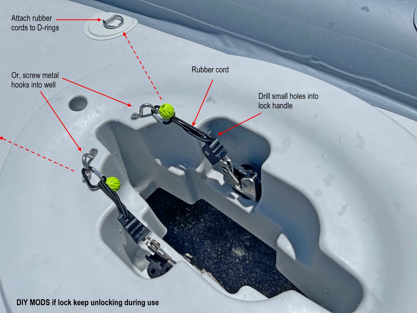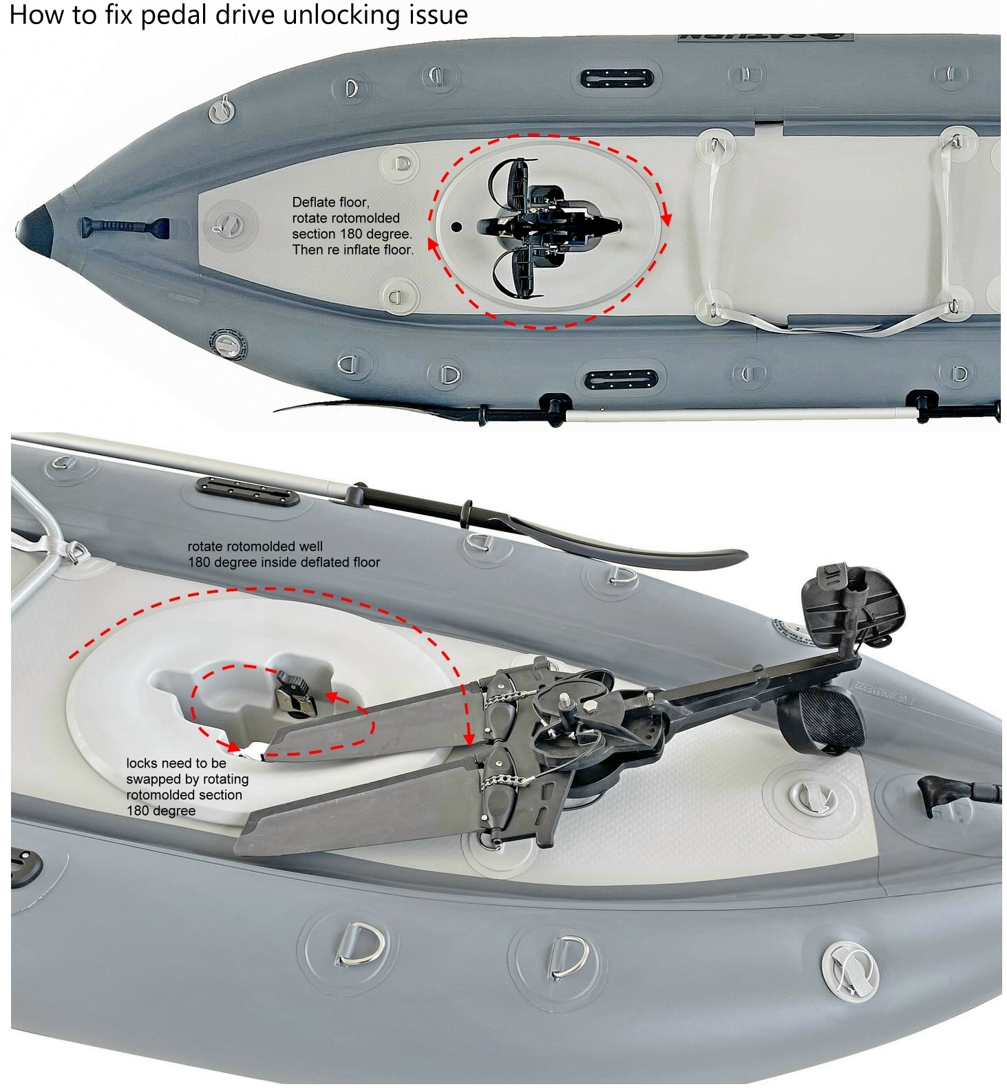 • Securing Pedal Locks - In the event of an accidental unlocking of the pedal drive during normal operation, consider using an additional rubber string. Wrap it over the lock handle and secure it to the self-adhesive hook glued to the rotomolded well insert. Refer to the Attachment tab for more ideas. Alternatively, resolve the unlocking issue by rotating the rotomolded section 180 degrees inside the kayak floor. Deflate the floor, rotate the part, and then reinflate the floor.