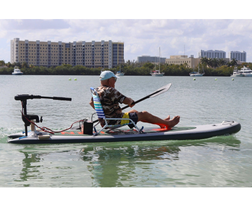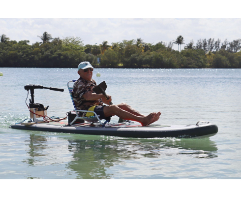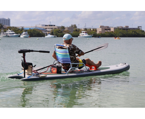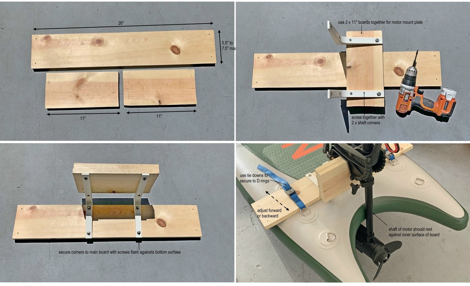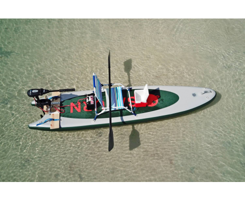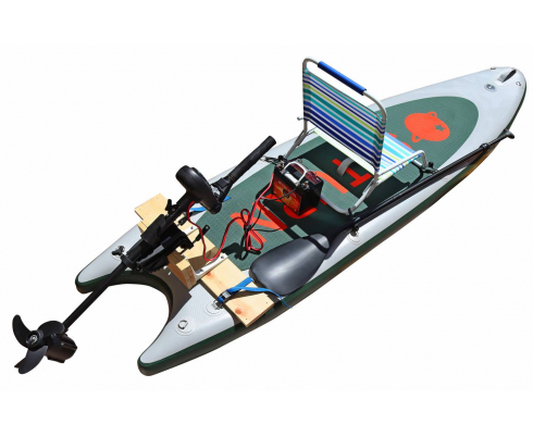 What makes this board even more unique, is additional set of 4 D-rings designed in such way that wooden board can be secured on top of board with help of 2 tie downs. Easy to do-it-yourself motor mount can be installed on top of wooden board, so that to add electric trolling motor, up to 55lbs. Please see instructions below. This will allow to use board as motorized watercraft for zipping around for hours with electric motor and 12V battery.