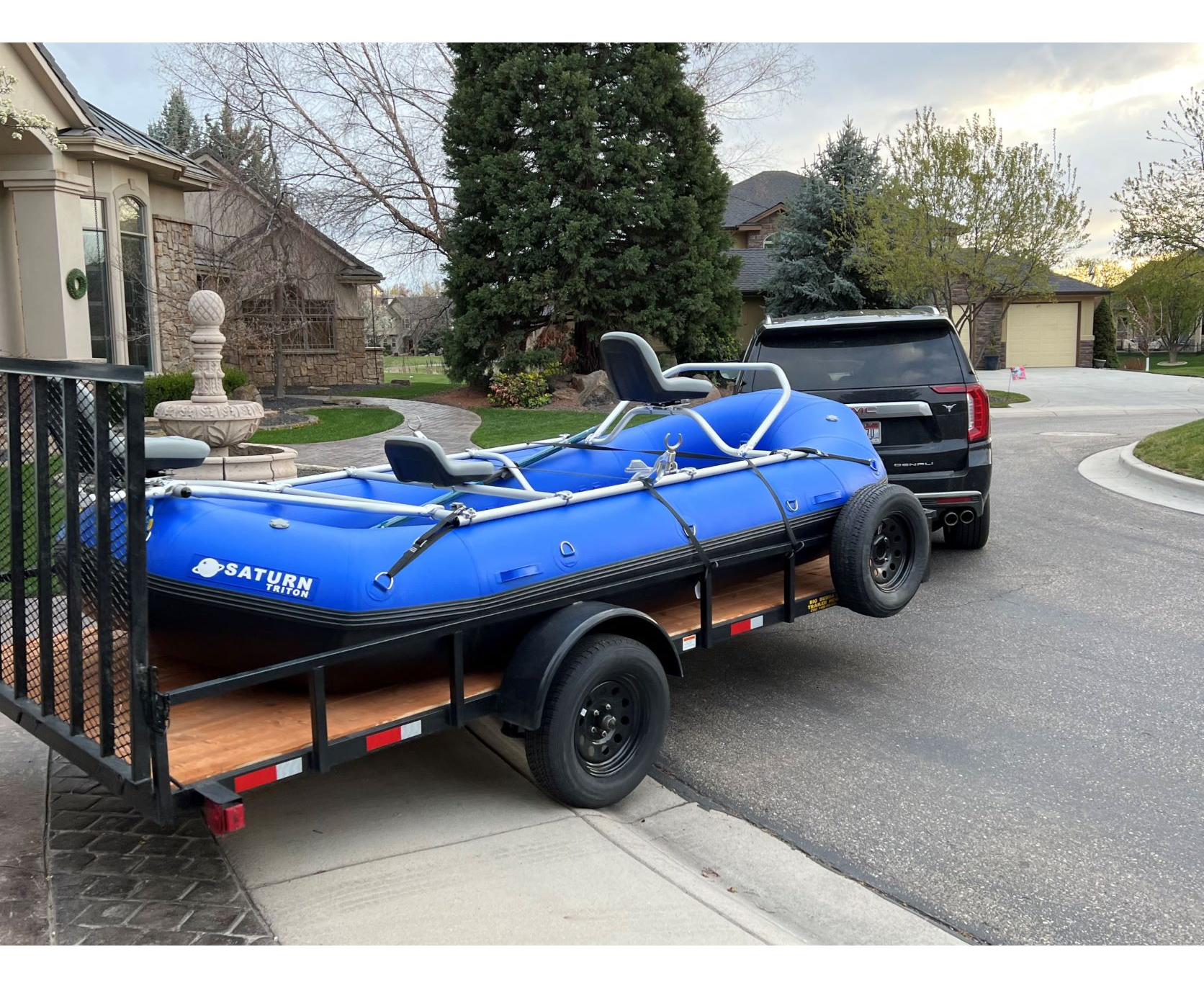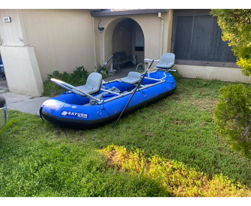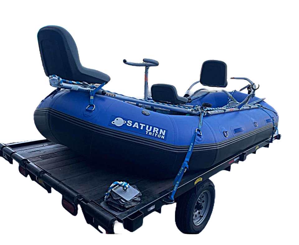 The all new 13'6" Saturn Triton Self-Bailing Whitewater Raft is the bomb and will likely soon become our best selling whitewater raft across the board. It represents our most stable, all around whitewater raft perfectly suited for big whitewater and heavy gear loads. We produced this custom designed 13'6" length x 6'8" width to provide the perfect size for day trips, 3-night river trips, and fishing adventures. The custom 60" center-to-center width and beefed up 20" diameter tubes was customized specifically for our 60" wide NRS frames. Also, check out this awesome video which outlines our typical NRS 3-Seat Guide Fishing Frame Package (picture shown below on the trailer) and each individual component of the package.